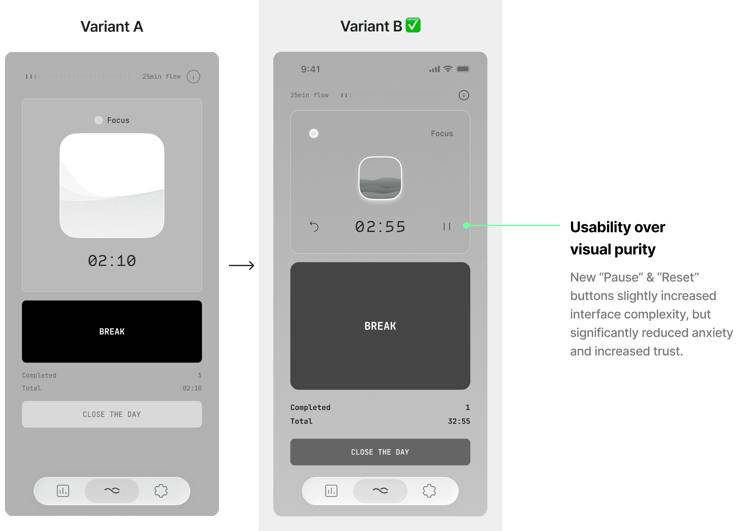 I initially aimed for strict minimalism. However when testing showed that users needed clear pause and reset actions to feel safe and in control. After comparing both variants, I chose to add these action buttons, making the system less rigid while preserving its core simplicity.