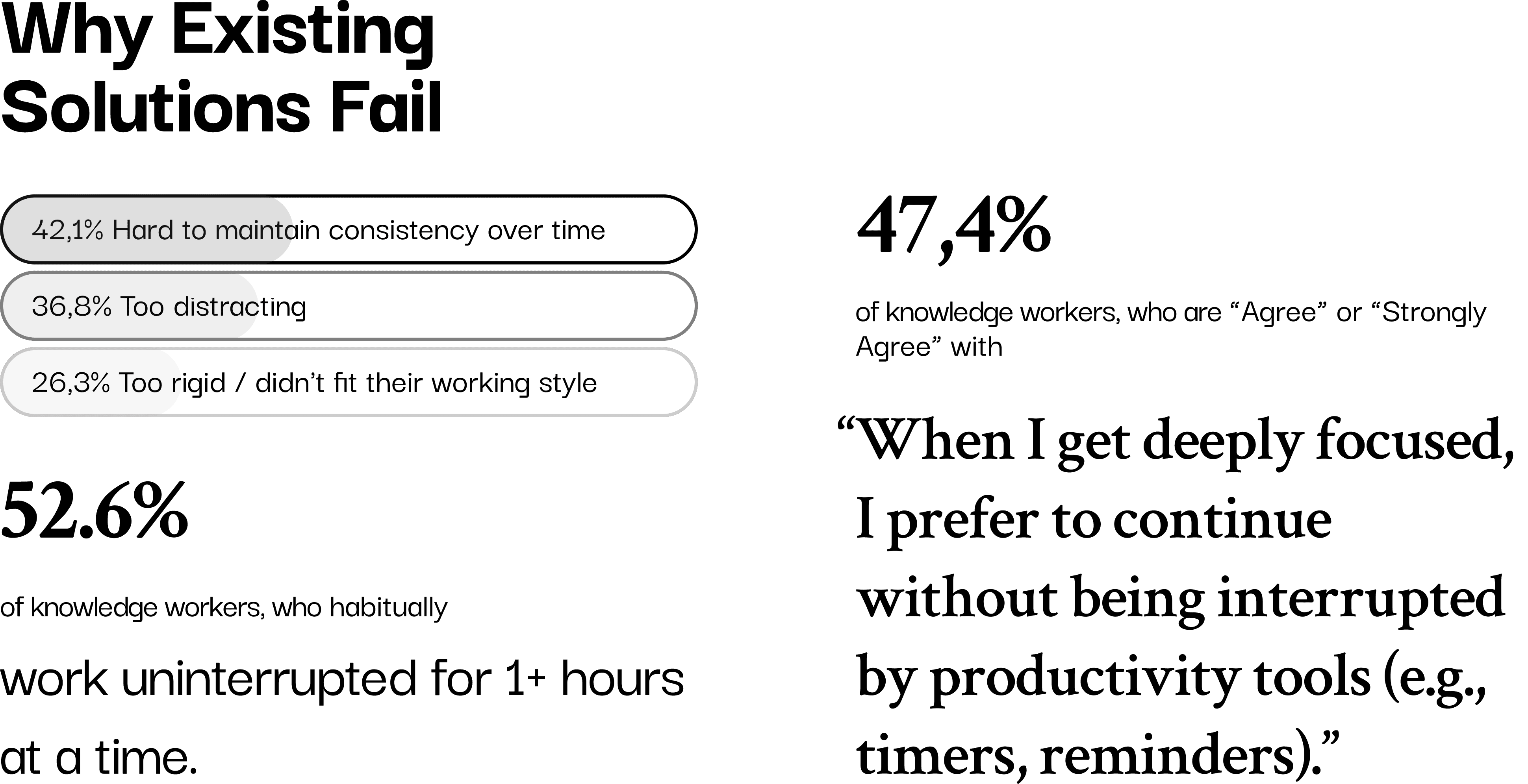 To understand what truly helps, I started with the people who rely on focus the most — knowledge workers and self-guided professionals managing long-term projects. I conducted quantitative and qualitative research: 19 survey responses from knowledge workers. 4 in-depth interviews with friends (3 PhD candidates and 1 freelancer). Here are some findings: