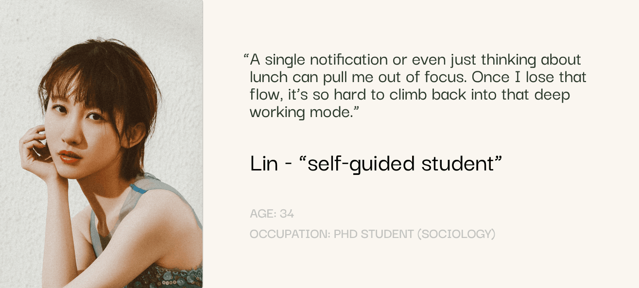 Based on insights from the survey and four interviews, I developed a persona representing my primary user group, self-guided knowledge workers who rely on long, independent work sessions.