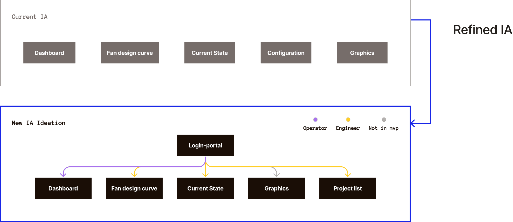 Stakeholder walkthroughs provided raw, technical explanations of the existing system. Mapping the current information architecture was the first step to organize these explanations into an explicit structure. This created a baseline that allowed us to reason about the system and prepare for later restructuring.